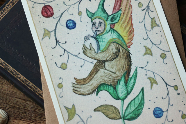 Carte postale médiévale- fée lutin – Aquarelle & dorures à la main – 10,5x15 cm avec enveloppe