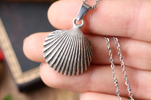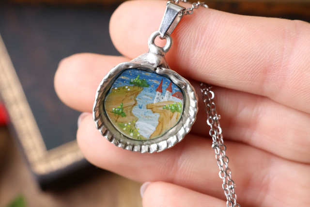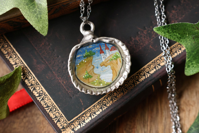 médaillon coquillage Chateau médiéval – peint à la main - acier inoxydable et laiton plaqué argent
