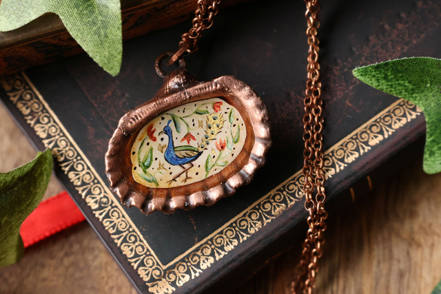 médaillon coquillage paon médiéval – peint à la main - Cuivre