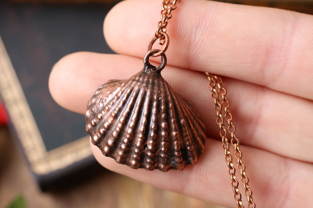Le médaillon est monté sur un support artisanal, un véritable coquillage recouvert de cuivre par galvanoplastie. Le cuivre est un matériau vivant qui pourra se patiner en fonction de vôtre peau.