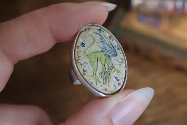 Bague dragon médiéval - artisanale - peinte à la main - laiton argenté