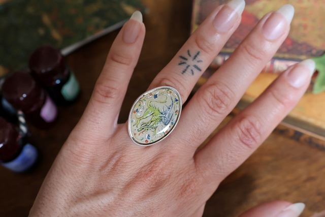 Plongez dans l’univers médiéval avec cette bague artisanale unique, peinte à la main, véritable œuvre miniature.