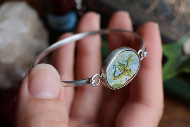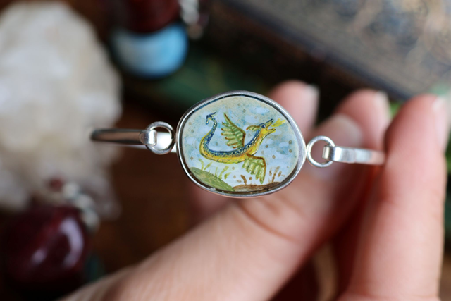 Bracelet dragon médiéval - artisanal - peint à la main - laiton argenté
