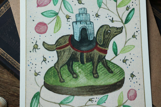 Carte postale médiévale- Chien Château – Aquarelle & dorures à la main – 10,5x15 cm avec enveloppe